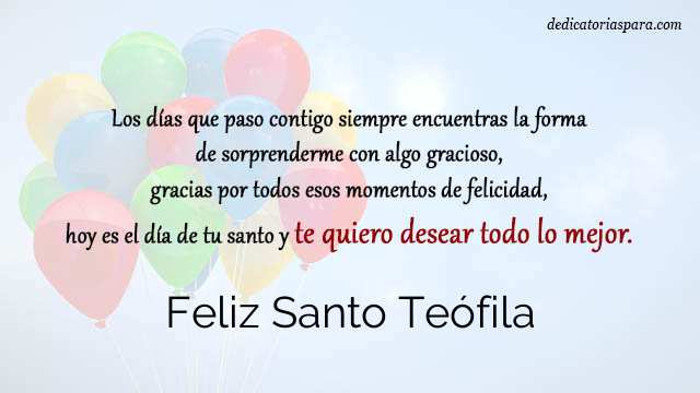 - Los días que paso contigo Teófila siempre encuentras la forma de sorprenderme con algo gracioso, gracias por todos esos momentos de felicidad, hoy es el día de tu santo y te quiero desear todo lo mejor. Muchas felicitaciones Teófila.